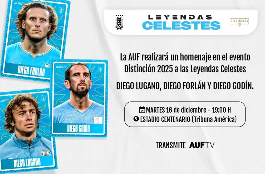 La Asociación Uruguaya de Fútbol realizará un homenaje a Diego Forlán, Diego Lugano y Diego Godín en el evento “Distinción 2025”, organizado por la Mutual Uruguaya de Futbolistas Profesionales (MUFP), que se desarrollará el martes 16 de diciembre, a las 19:00 horas, en la Tribuna América del Estadio Centenario.