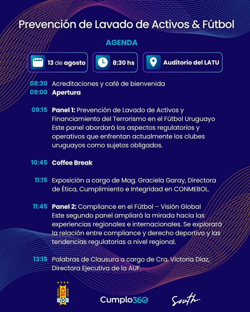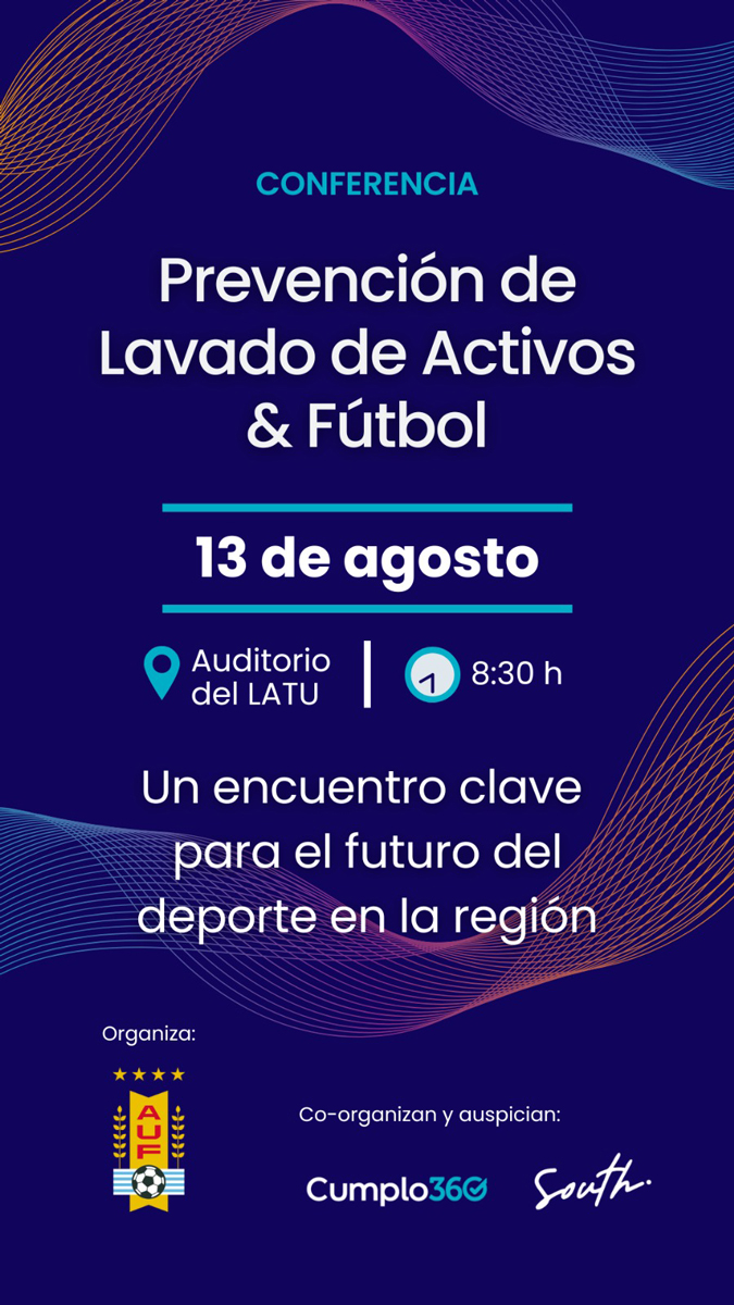 La Asociación Uruguaya de Fútbol (AUF), en coordinación con Cumplo360 y South, anuncia la realización del Summit “Prevención de Lavado de Activos & Fútbol”, que se llevará a cabo el próximo 13 de agosto a las 8:30 horas en el Auditorio del LATU.