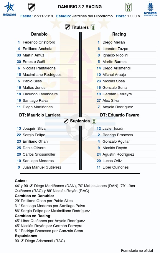 Danubio venció 3-2 a Racing como local en el estadio Jardines del Hipódromo, esta tarde por la 14a fecha del Torneo Clausura 2019.