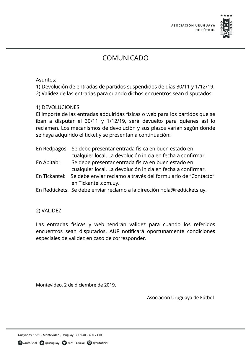 La Asociación Uruguaya de Fútbol emitió el siguiente comunicado referido a las entradas para los partidos suspendidos de los días 30 de noviembre y 1 de diciembre.