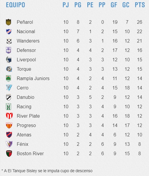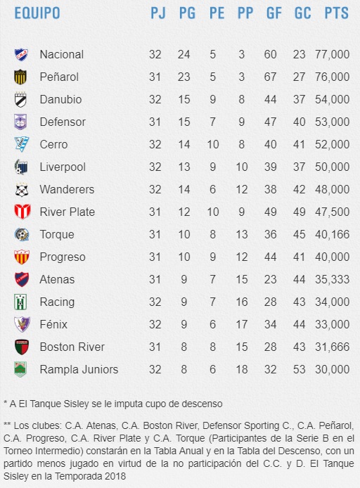 TABLA DE POSICIONES DEL TORNEO CLAUSURA Y DEL CAMPEONATO URUGUAYO 2018
