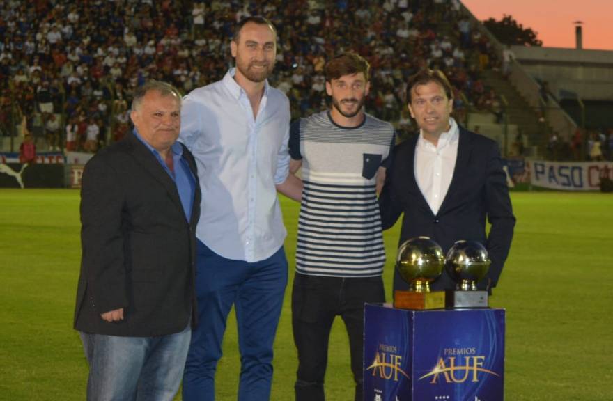 El Dr. Juan Ceretta y el Sr. José Emilio Fernández, presidente y secretario de la Mesa Ejecutiva de Primera División, fueron junto a Michael Etulain, presidente de la Mutual Uruguaya de Futbolistas Profesionales, los encargados de entregarle a Viña, las dos distinciones.