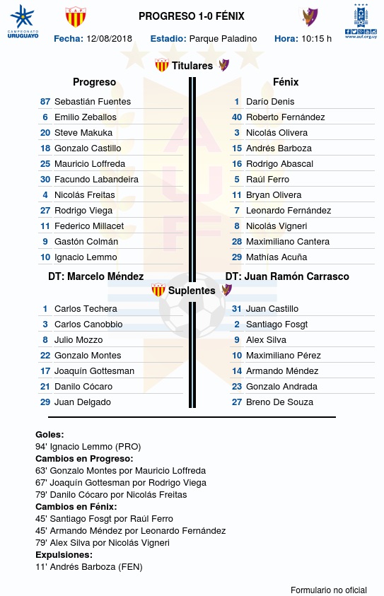 Progreso superó 1-0 a Fénix, como local en el Parque Paladino, este domingo (12/8) de mañana en el Parque Paladino por la 4ª fecha del Torneo Clausura 2018.