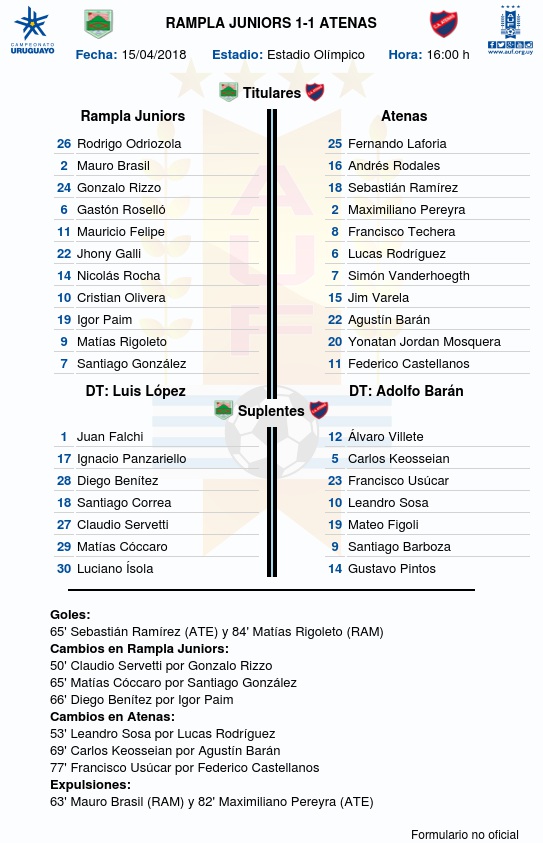 Rampla Juniors y Atenas igualaron 1 a 1 en el Estadio Olímpico, este domingo (15/4) de tarde por la 12ª fecha del Torneo Apertura 2018.