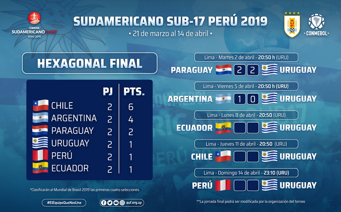De acuerdo al fixture, la Celeste jugará el próximo lunes 8 de abril en la tercera fecha de la Fase Final rumbo al Mundial de Brasil 2019 ante Ecuador a las 20:50 h de Uruguay. A este torneo clasificarán las primeras 4 selecciones.